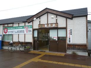 「仙山線全線開通70周年」の横断幕がかかった愛子駅の駅舎。