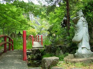 左側に太鼓橋と仏像が。