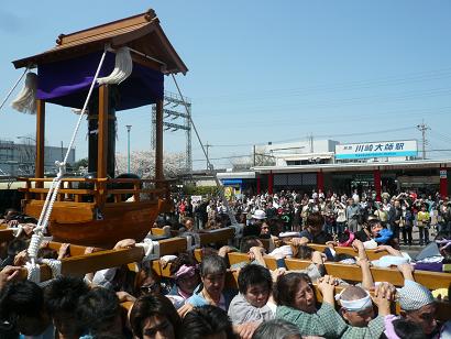 まずは川崎大師駅前をかなまら舟御輿が通過。