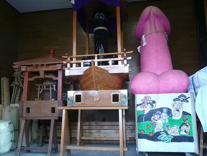 御輿蔵に置かれた、かなまら大御輿、かなまら舟御輿、そしてエリザベス御輿。