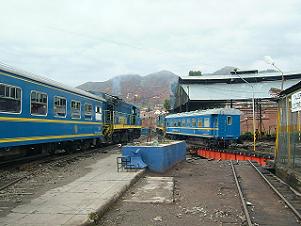 ペルー・レイルの始発駅、サン・ペドロ駅でならぶマチュピチュ行きの列車。