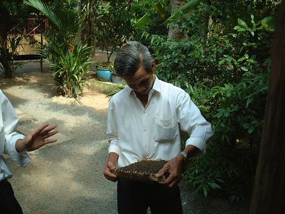 村のカフェで蜂の巣箱を持って説明するおじさん。
