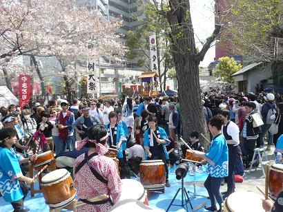 若宮八幡宮の境内で太鼓が打ち鳴らされる中、かなまら舟御輿が帰還。