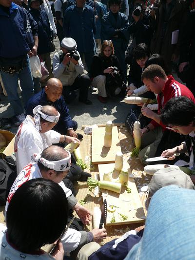 多くのギャラリーが見守る中、みなさん真剣に大根を削っていきます。