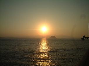 そして日が沈みかけるころ、遠くに大きな島影が。