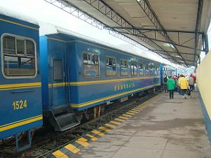ペルー・レイルの始発駅、サン・ペドロ駅でならぶマチュピチュ行きの列車。