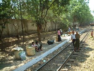 DANYINGON駅ではたくさんの乗客と荷物が待っていた。
