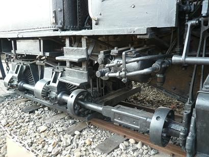 普通の蒸気機関車は前の写真のように動輪をつなぐ棒(ロッド)に直接動力を伝えて回転させる仕組み。
