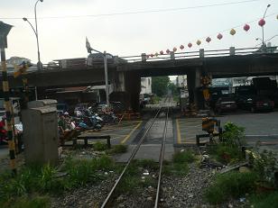 高架道路をくぐると反対車線の踏切がある。